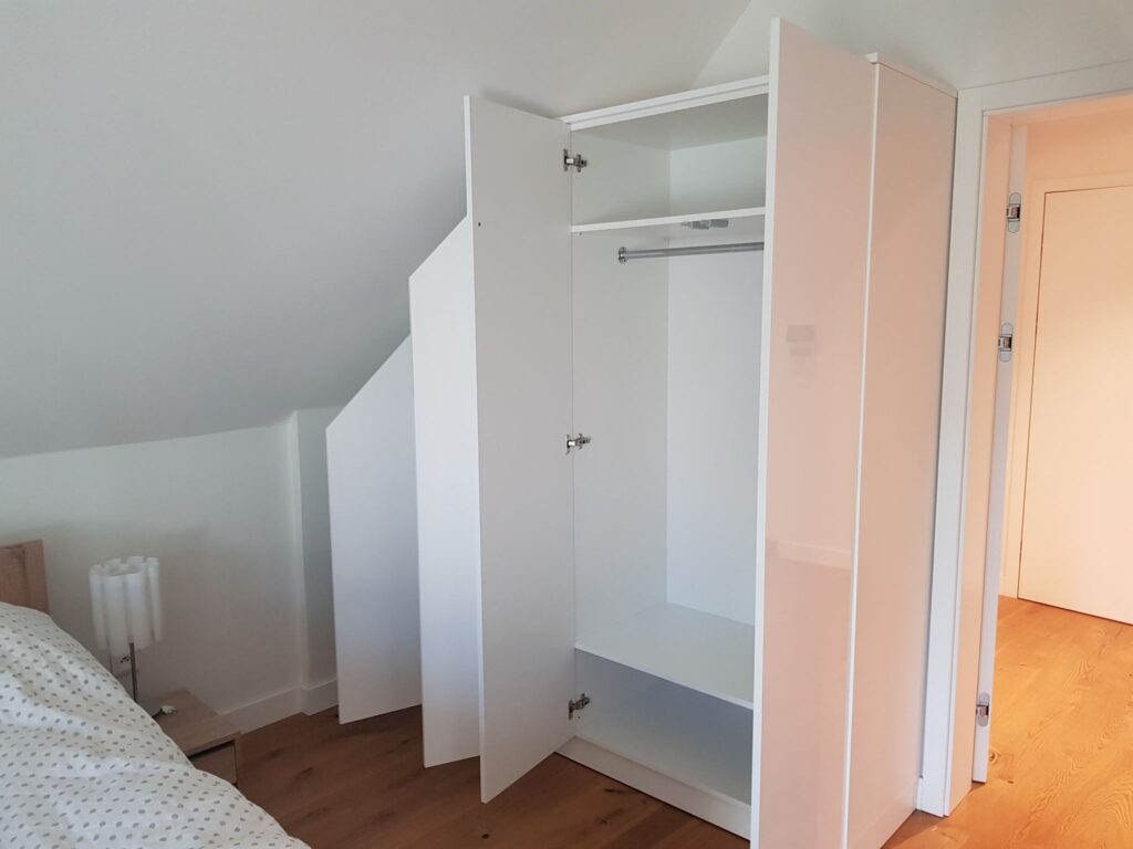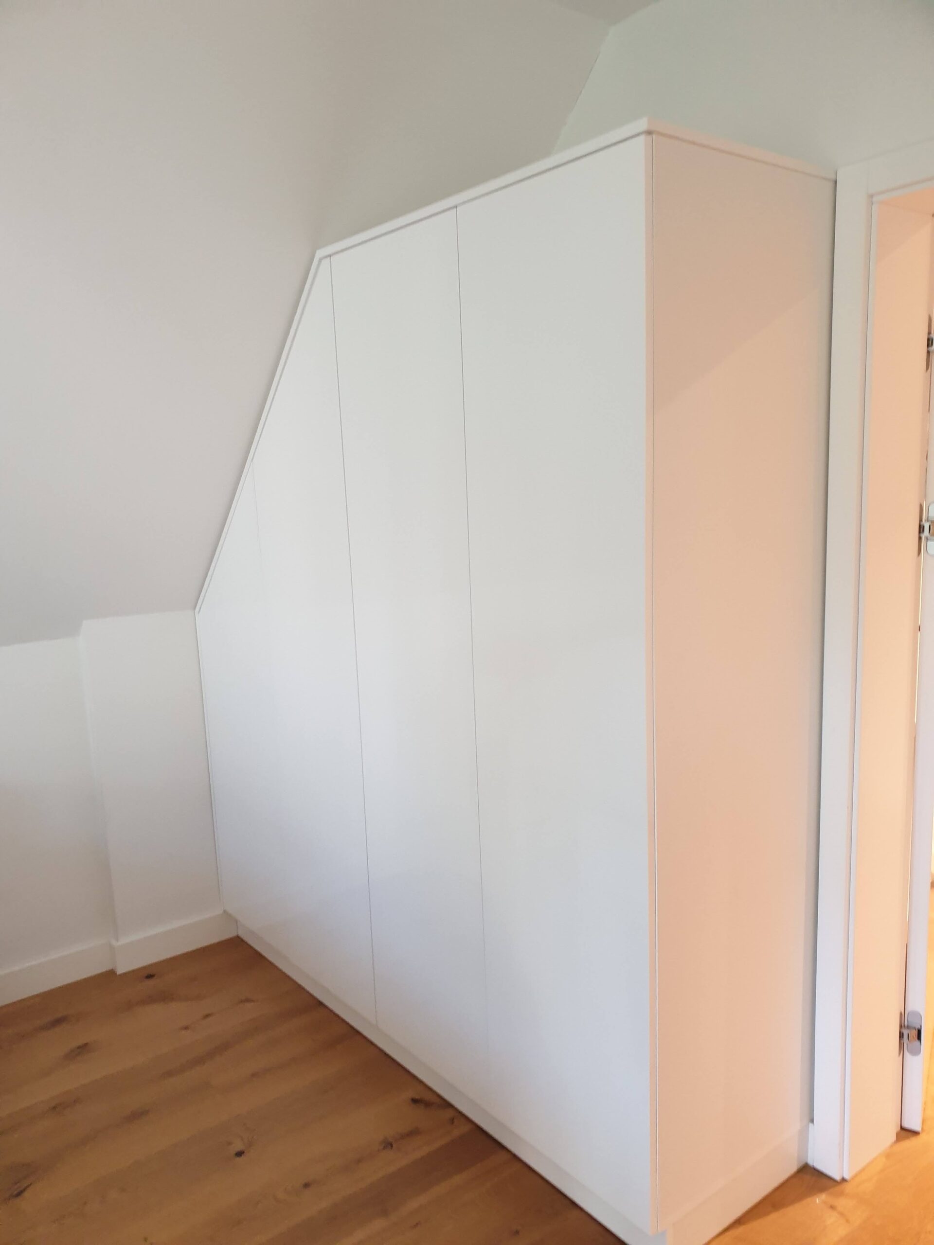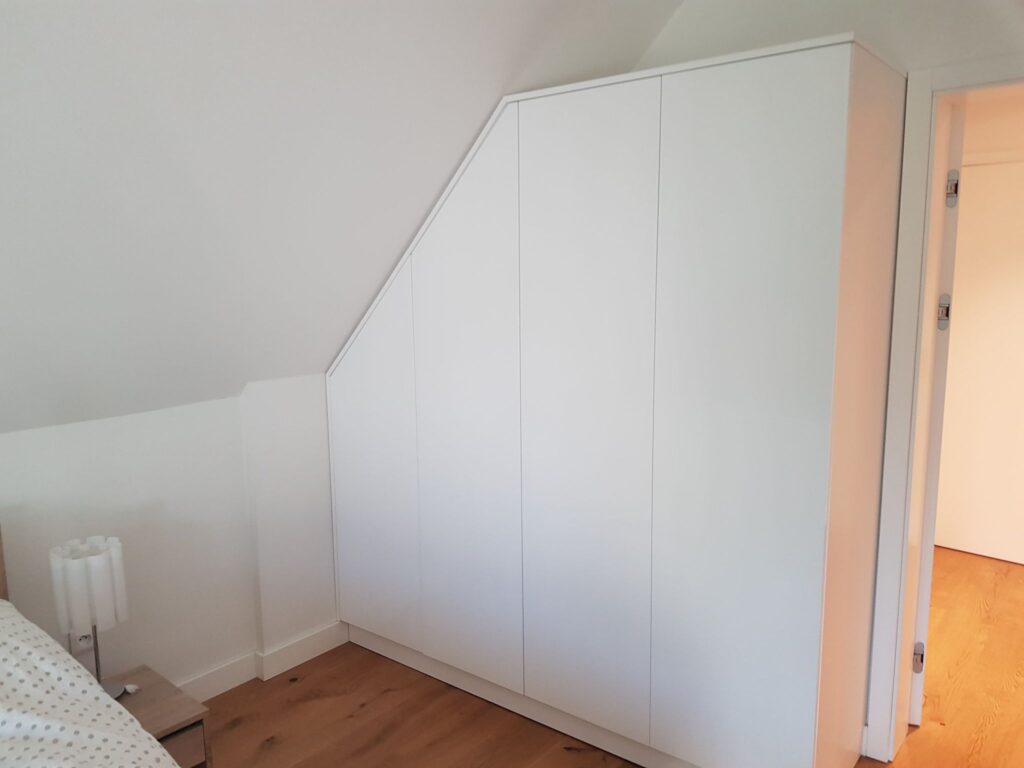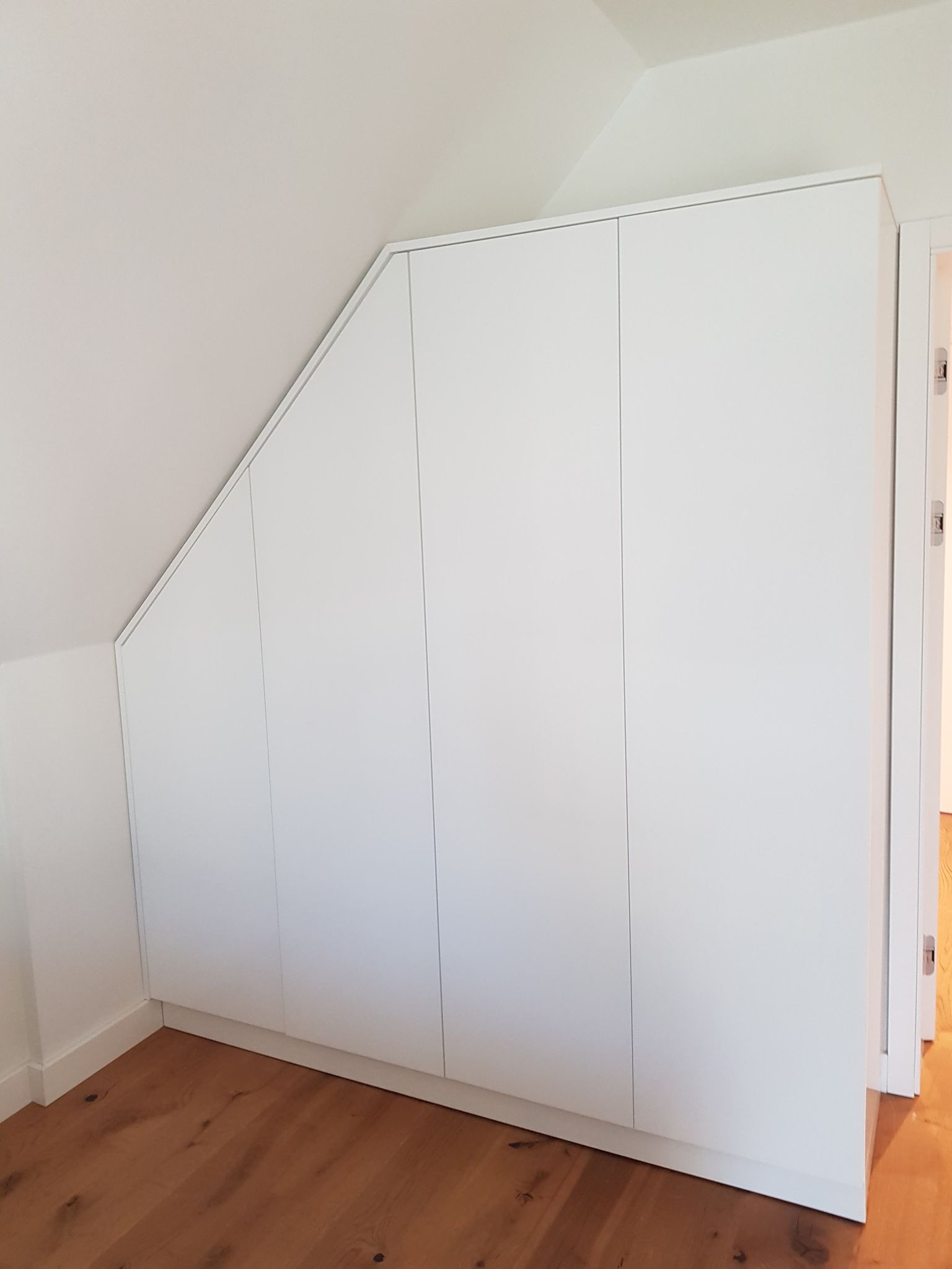 Zabudowy skośne na poddasze z drzwiami przesuwnymi, jak i otwieranymi w tradycyjny sposób.